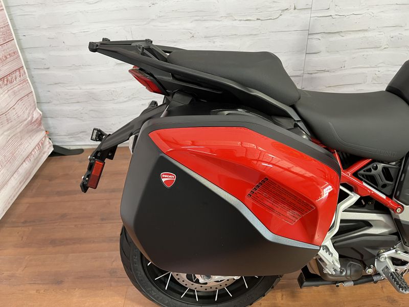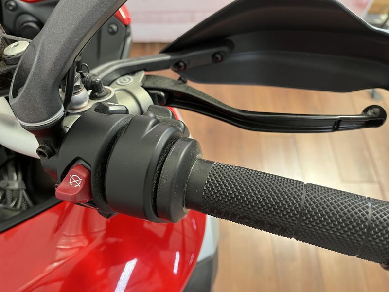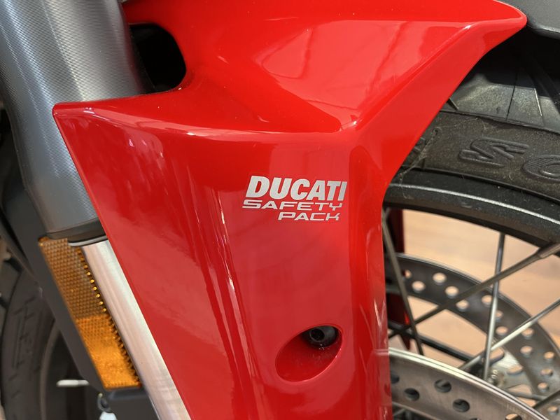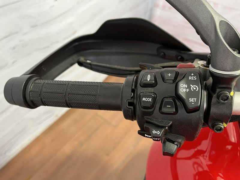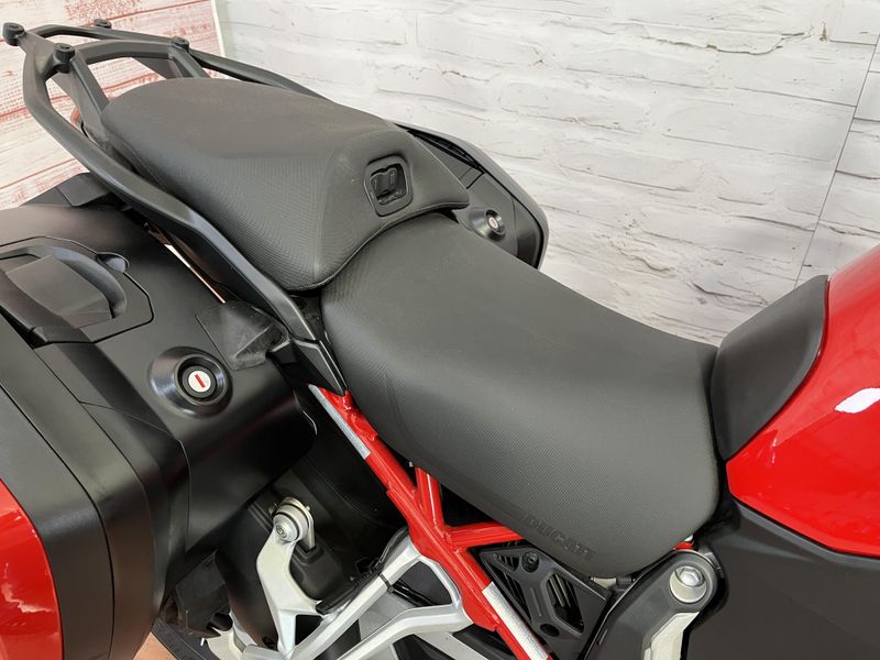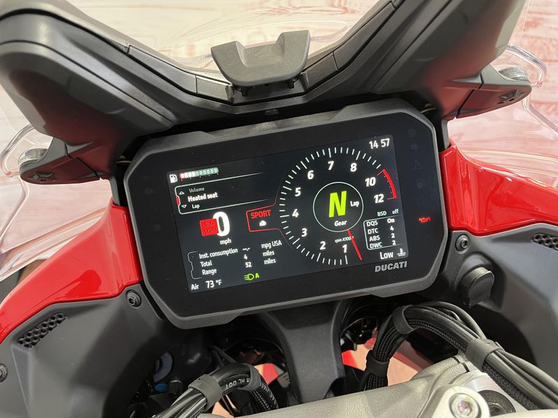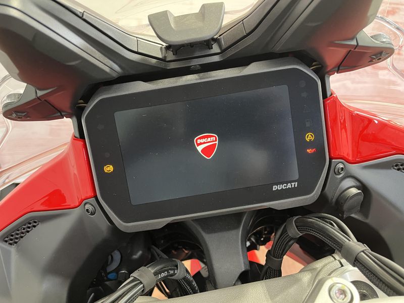 • Standard Equipment: Ducati Skyhook Suspension, Minimum preload, Ducati Quick Shift, Cruise control, Hands-free, Backlit handlebar switches, 6.5" TFT colour display with Ducati Connect and full-map navigation system, Full LED headlight, Tire pressure monitoring system (TPMS), Hands-free fuel tank cap, Auxiliary LED lights, Heated rider seat, Heated passenger seat, Heated handgrips, Central stand, Plastic side panniers