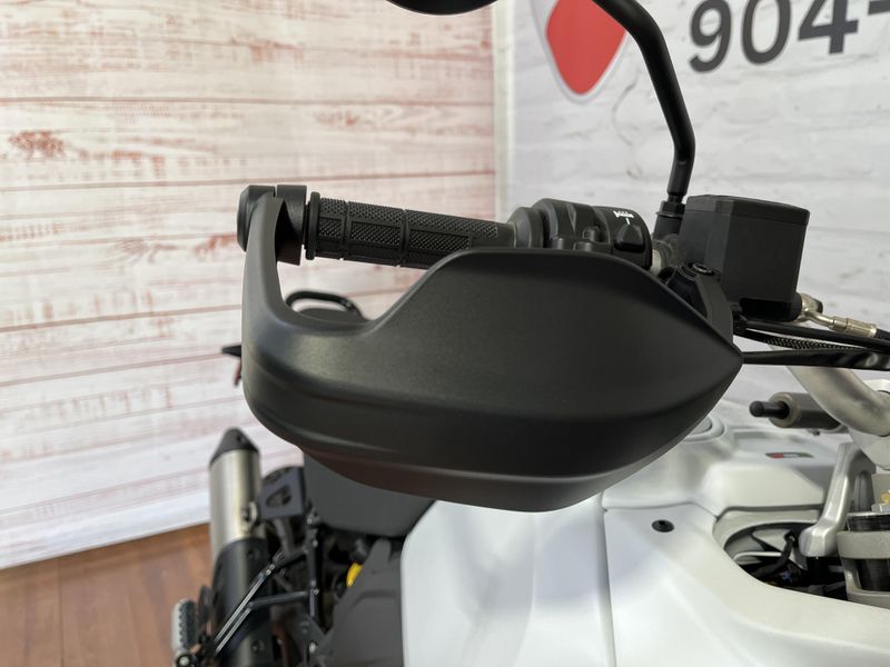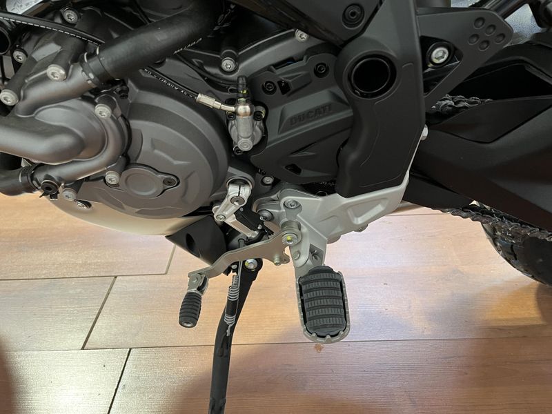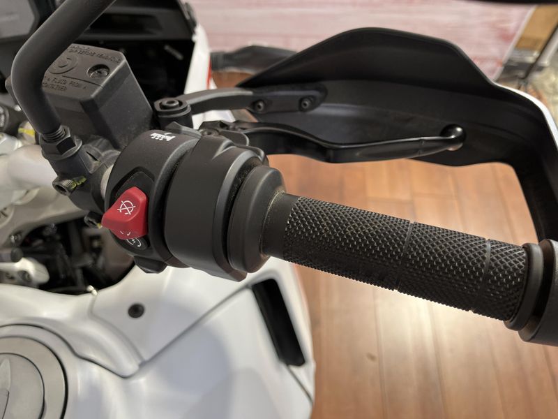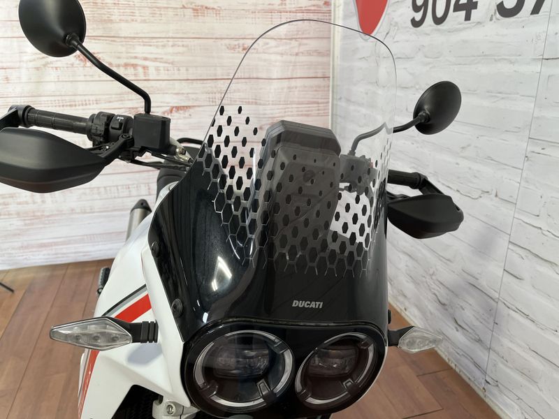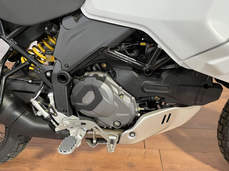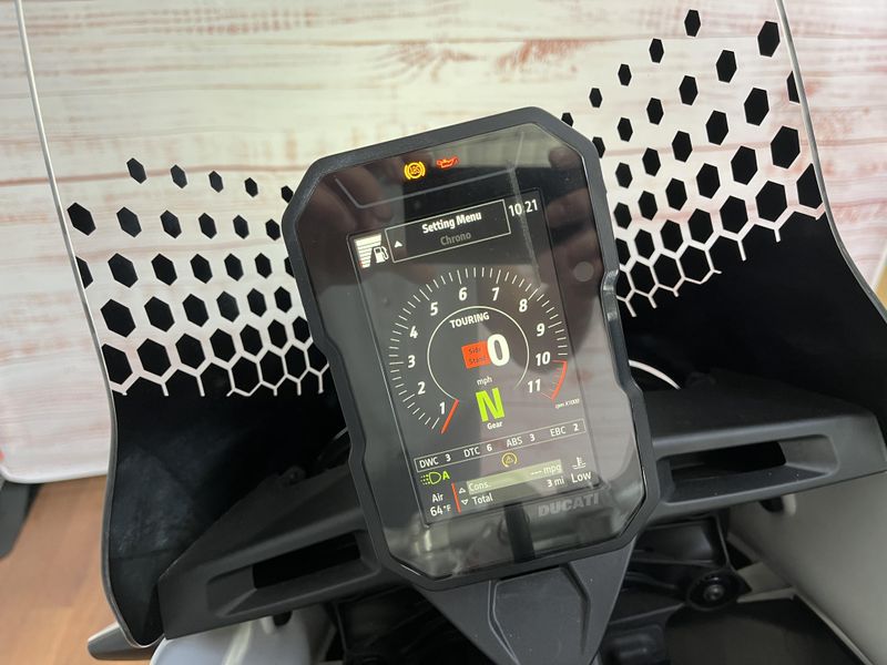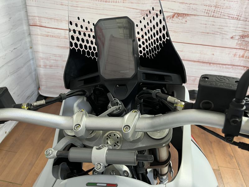 • Standard Equipment: Riding Modes, Power Modes, Ducati Wheelie Control (DWC), Engine Brake Control (EBC), Ducati Quick Shift up/down (DQS), Cruise control, full LED lighting system, DRL, Ducati brake light (DBL), USB power socket, 12V socket, self canceling turn indicators, Steering damper, Li-on battery; Discovery equipment: Ducati Multimedia System (DMS), Turn by turn navigation via app, central stand, engine cover in steel tubes, water pump protection, protection grid for water radiator, heated grips, engine guard plate, reinforced handguards, touring windscreen